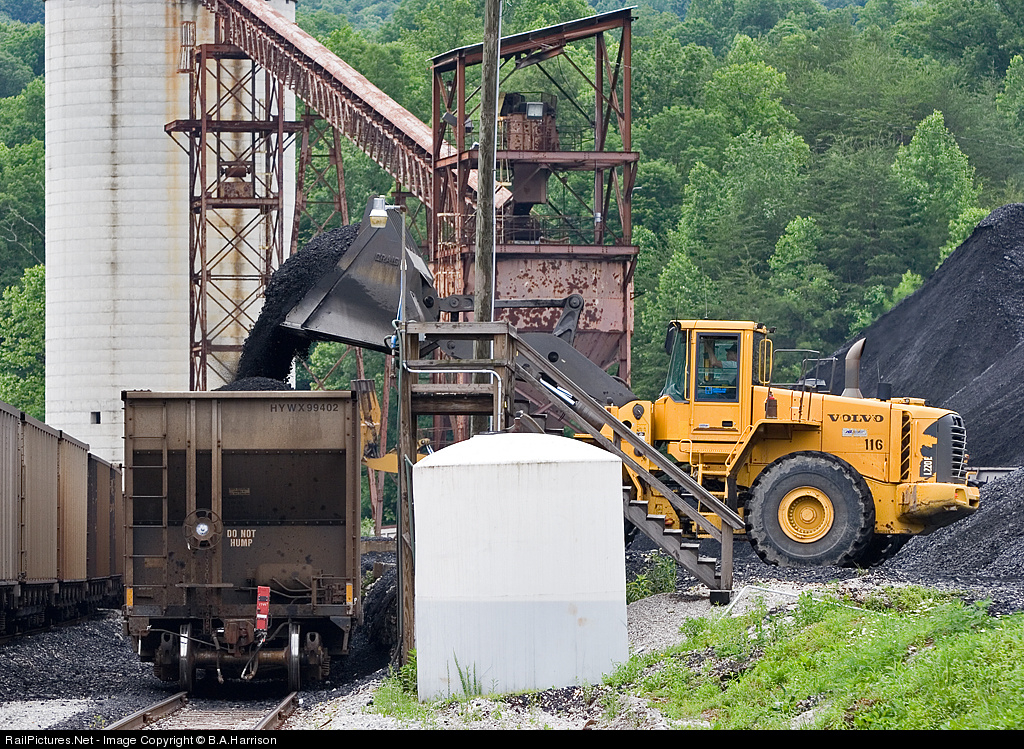 Loading coal the hard way with frontend loaders. The old loadout has fallen into disrepair behind the stockpile and beltlines.