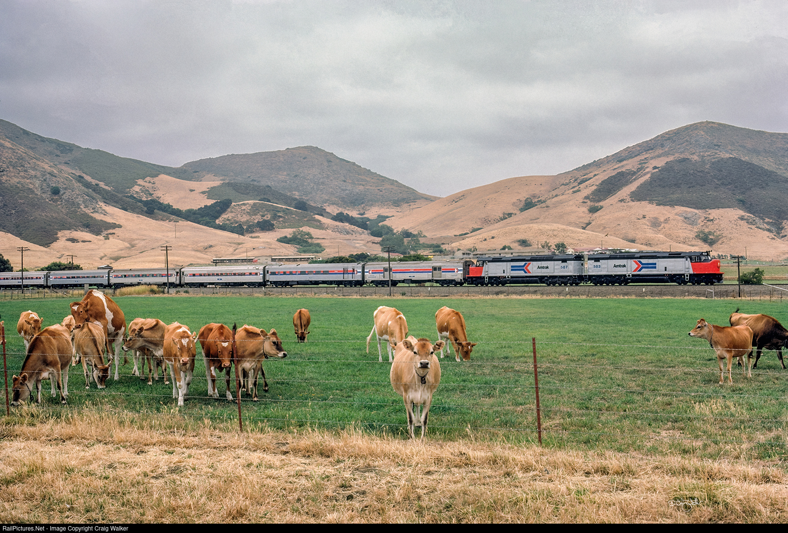 Amtrak train 11, heading south ("east" on the Southern Pacific) on the SP's Salinas Sub, the Coast Starlight, passes through the pastures of Cal Poly University (which has an extensive agricultural program). Two-month old SDP40Fs 583 and 587 are in charge of this train as it travels along the nearby Pacific Ocean (and thus the overcast skies in July!) from Seattle to Los Angeles.