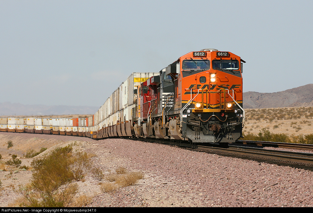 BNSF 6612 leads Eastbound stack train across the Needles Sub along with NS and CP pool power units.