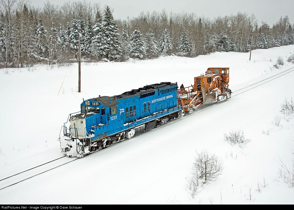 | Seldom used veteran Reserve Mining SD18 1231 pulls the railroad's Jordan Spreader towards milepost 32 where they will reverse direction and plow towards milepost 18, making a pass over the snow covered "south track" at this location. |