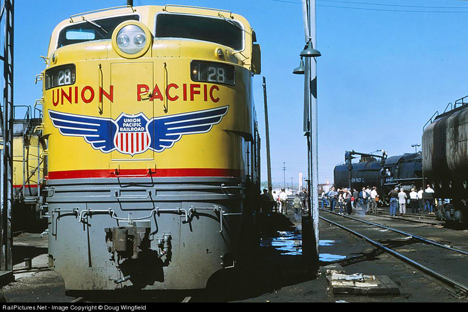 UP turbine 28 is on the shop track at Cheyenne while 8444 is taking on oil in preparation for a fan trip to Yoder, WY on June 1, 1968. The trip originated in Denver and 8444 pulled the train to Cheyenne where it was cut off and sent to the shop for service, allowing riders access to the shops, including three sets of turbines (numbers 15, 21 and 28).