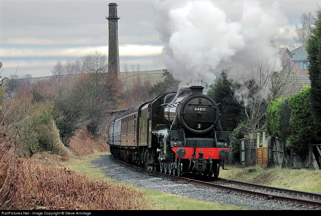 | The LMS 'Black 5' 4-6-0s are widely (and rightly) acknowledged to be a classic British mixed traffic design. They are regarded by photographers as a mixed blessing probably because no less than eighteen of the class are preserved, or possibly because their no-nonsense black livery is rather uninspiring. Nonetheless many fine images of these wonderful machines grace the Railpictures files. One of the later (1945) examples No.44871 gets away purposefully from Rawtenstall. Enthusiastic volunteers have thoughtfully cleared the lineside of the unsightly brambles that had grown here in recent times. |