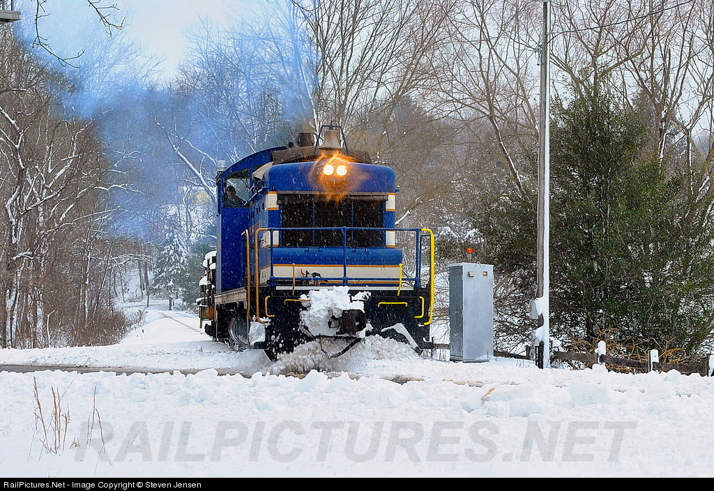 | The Day before the Lerro Productions Photo Charter, 114 was sent out to clear the line for 98. With her, she carried a flatcar of ties to be delivered to NVF for the track crew. Here we see the small freight bursting through a small pile of snow at Barley Mill Road. |
