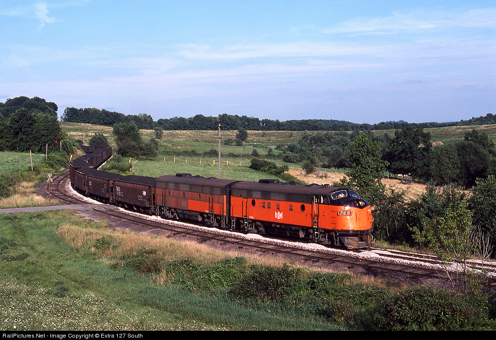 B&LE F7A No. 728 leads the daily Western Allegheny RR freight train through an S curve just east of Buena Vista, PA on August 25, 1979.