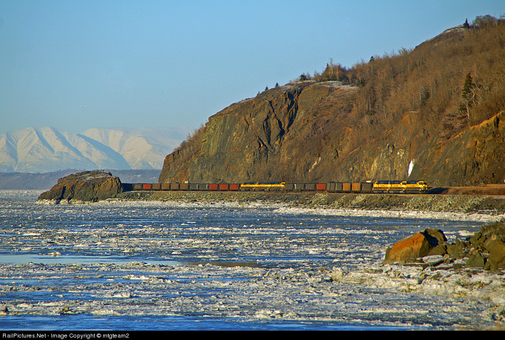 | An Alaska coal trains winds its way along Turnagain Arm in the Beluga Block in a 3+3+1 configuration. While the railroad is flat here the extra horsepower will be needed to climb Grandview and Divide Hills grades that are in the 3% range. It was a balmy -17 degrees on the day this picture was taken a little over two weeks ago apparently that weather followed me home to Colorado where the last few days we have experienced similar temps. |