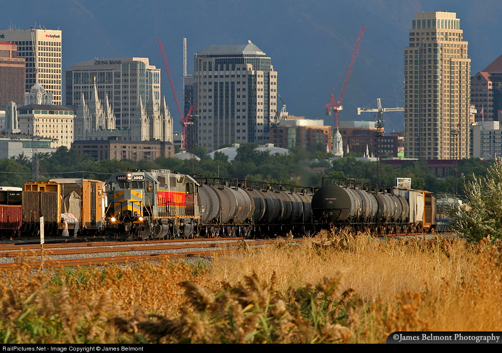 Utah Railway's RUT312 local rambles east through UP North Yard in Salt Lake City, Utah.The city skyline contrasts well against a storm system parked above the nearby Wasatch Mountains. UR 3002 is an EMD GP40, built new for the Western Pacific as the WP 3525 in October 1971. Chances are good the 3002 visited North Yard several times both during the WP era and after the merger with UP. Prior to it's tenure on the Utah Railway it served on the UP (assigned UP 674, not renumbered); returned to owner/leaser in August 1985; sold/leased to Chicago Missouri & Western CMNW 3525, then CMNW 3008, then Gateway Western 3008; to KCS when that road took control of GWWR, to KCS 3150, to KCS 2700, then sold to the Utah Railway in October 2006.