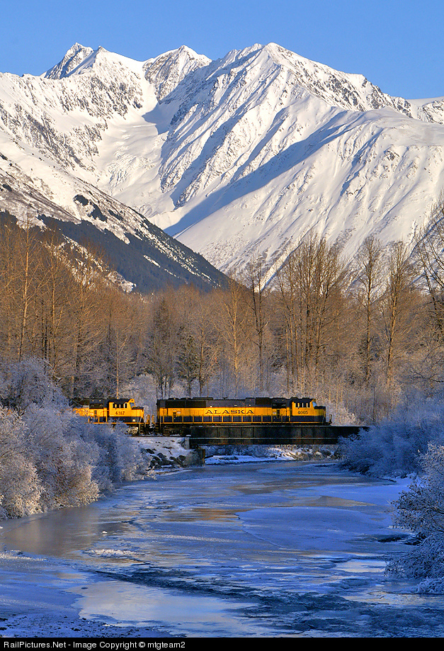 Alaska Railroad SD70MAC crosses Glacier Creek just a half mile south of Girdwood. In the background are the Chugach Mountains. Some of Alaskas best skiing is in these mountains at Mt. Alyeska Ski Resort. Here you can ride a tram to the top of Mount Alyeska and see the railroad in the valley far below.