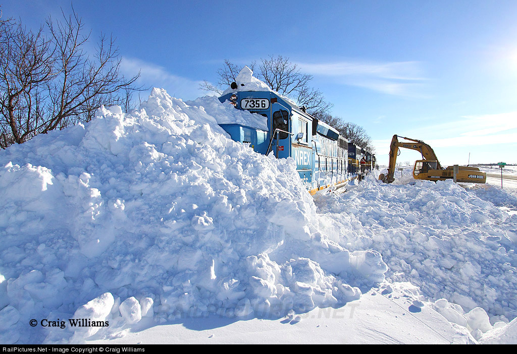 Well 579 was to cutoff its train at Ossian and run their power over to Ft Atkinson to help 606 up Calmar Hill since they had bad power. Due to 579 having bad power too and authority restricting their speed, they didn't make it very far. Here at MP 39 they are stuck in a decent drift. Contractors begin the task of clearing the snow away so the power can be unstuck. Fun times on the Mason City Sub!