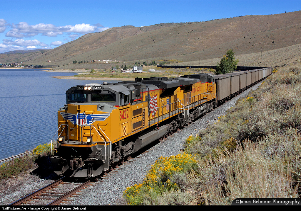 | Union Pacific's Valmy, NV to Skyline, UT coal empty rambles slowly along Scofield Reservoir at milepost 11 of UP's Pleasant Valley Subdivision. |