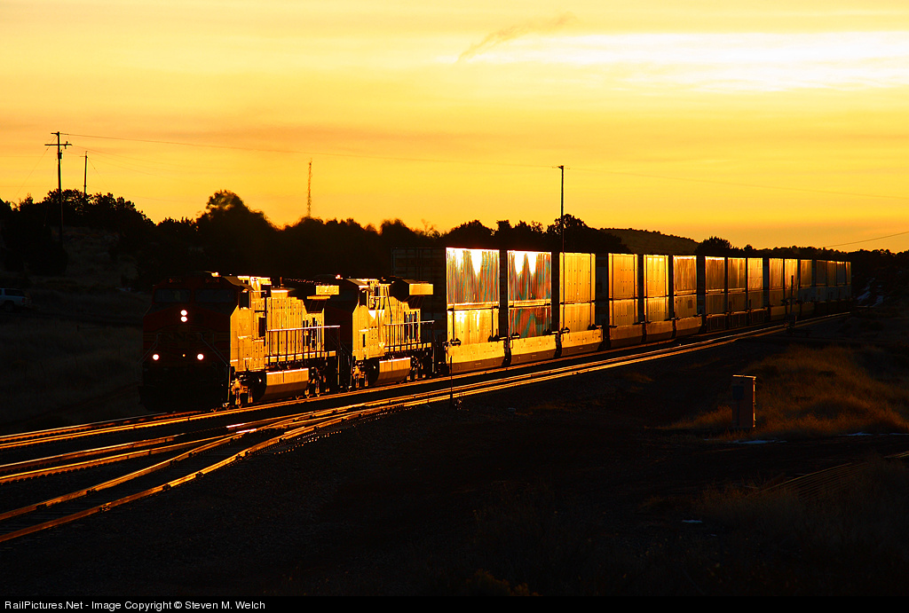 | First light glints off the side of a Westbound stack train climbing towards Flagstaff and the Arizona Divide. If you click on BNSF 5024, you'll see that I shot this train about 12 hours before RP Admin Chris Starnes did! Now only if I could get a PCA like he did... ; - ) |
