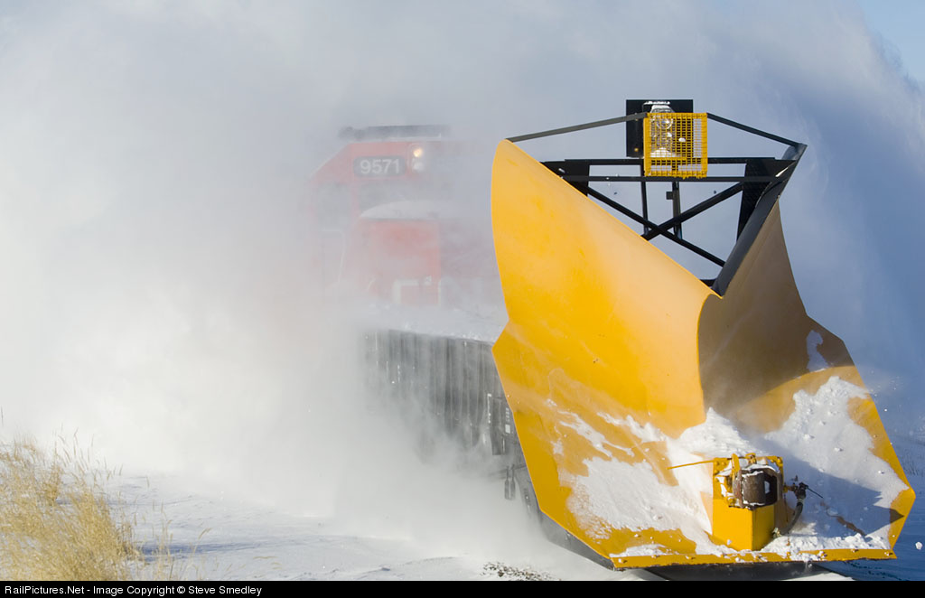 | An Illinois Central wedge snow plow rolls Northward between Clinton and Gilman, Illinois on Thursday Feb. 3, 2011. CN 9571 and a sister GP38-2 are shoving the plow Northbound as they did into a snowdrift.