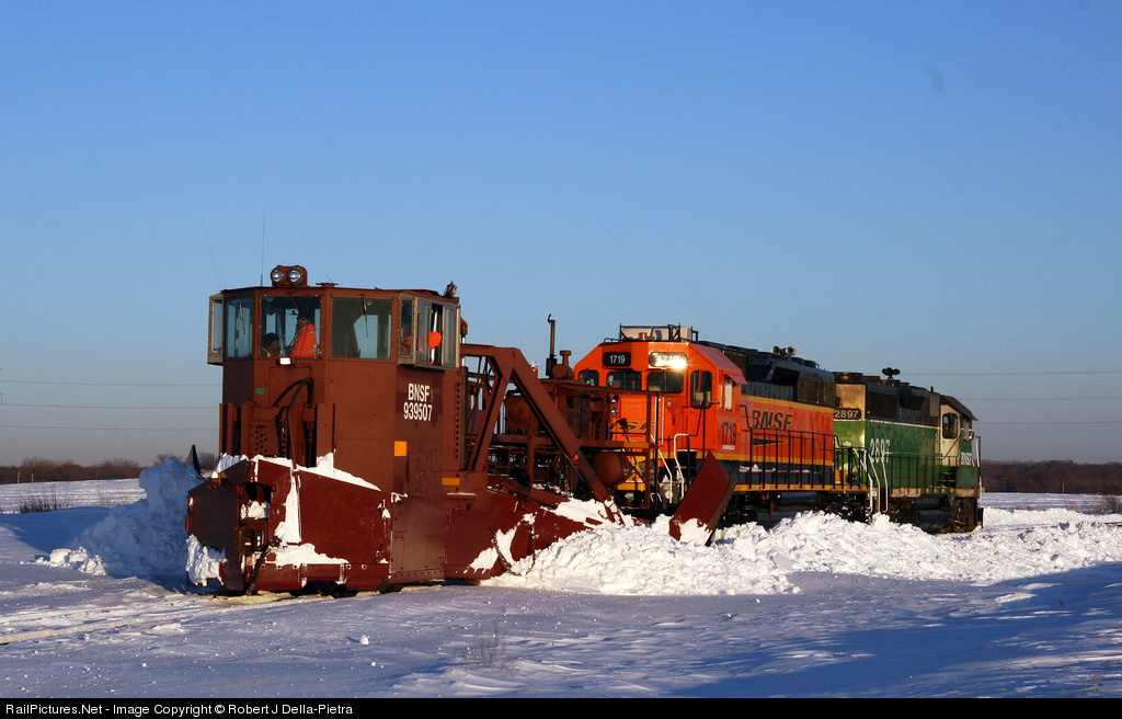 | Still recovering from the blizzard that we had 3 days prior to this, the BNSF set out a Jordan Spreader to remove a majority of the snow away from the ROW. |