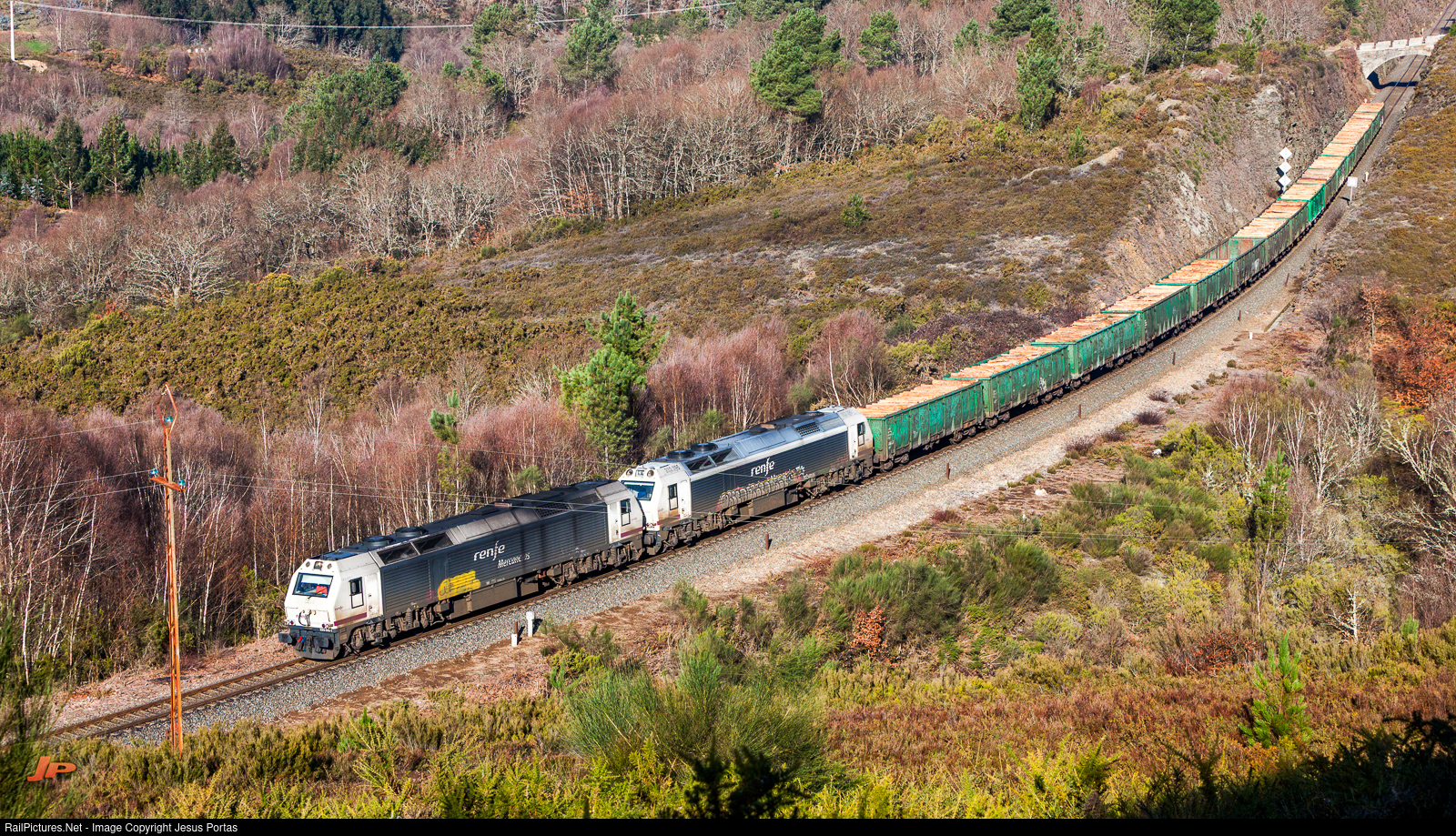 Renfe 333-310-1 + 333-395-2 in the head of a train loaded with wood from A Susana to Tuy.