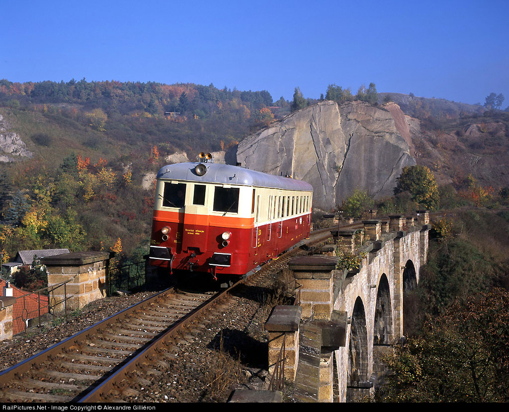 Historical railcar M262.1117 on the stone bridge above Praha-Hlubocepy, in the western outskirts of Prague. The line from Praha-Smichov to Praha-Zlicin is also known as 'Semmering of Prague' due to its numerous curves and viaducts.