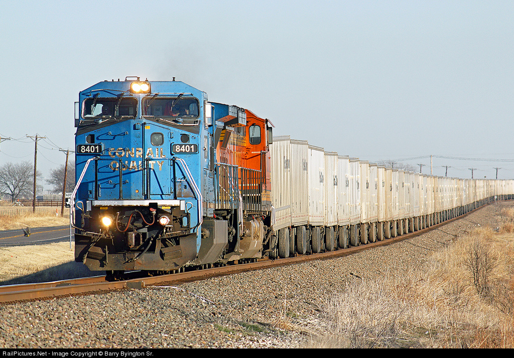 On the ex-Santa Fe, waiting on the south side of Ponder was the northbound Z that would be the BNSF participant later on at Metro, waiting hanging out the south switch, due to the 4 crossings that would sever the town if the train occupied the siding. This is usual SOP here, so I parked on the east side, waiting for the two blasts of the horn sgnifying the meet was eminent. It was at this time the memory machine was awakened to days gone by on the ex-Santa Fe. In those days, once visual or radio contact was made, the train awaiting would erupt in a smoke filled sky, wanting to clear the switch before the other was around the curve, thereby handing the opposing train a clear, and then resulting in a notched out, smoke enhanced acceleration. I was not dissapointed, as the northbound Z notched it out, smoked it up and horn blaring, raced to the north switch. I wanted to get to a favorite spot south of town, so I was watching everything transpire in the side and rear-view mirror; I saw the southbound road-railer come around the curve to the tangent just as the Z cleared the switch. From the time the Z cleared to the time the signal cleared was less than a minute, announced by the notched out ex-CR C40-8W and punkin' dash blackening the sky. By the time he made it to my spot, he was already notching it down, as the 55 was reached quickly. In the distance I could see the exhaust haze from the northbound Z as he was shooting for long gone out of Ponder.