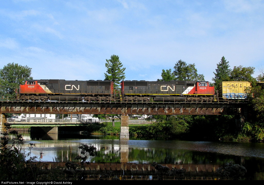 High above the Oswegatchie River in Gouverneur, A pair of CN units lead manifest and intermodal traffic southward towards a crew change in Phildadelphia.