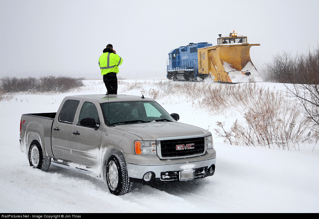 Fellow RP contributor Aaron Schlegel stands atop our chase vehicle to get a higher perspective of Marquette Rail's first plow run of the year.