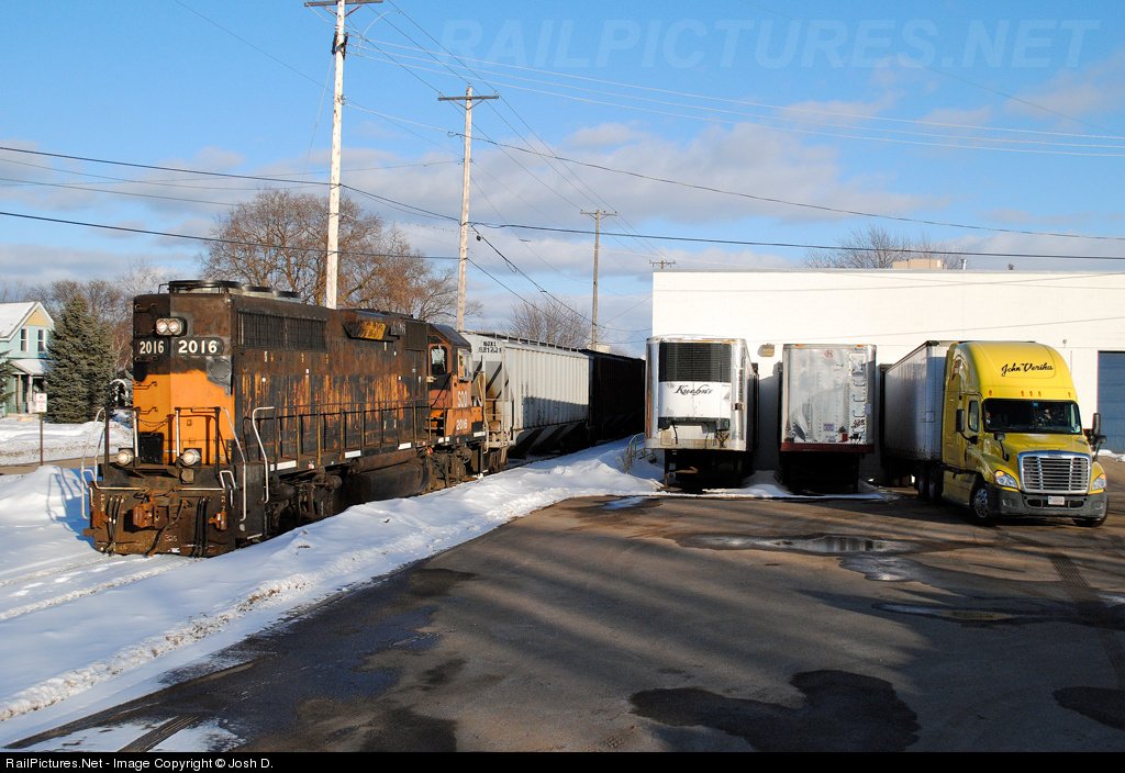 | Beer or candy? A truck arrives at the Brach Candy Factory, while Soo 2016 shoves a cut of hoppers down to the Malt Company for loading. |
