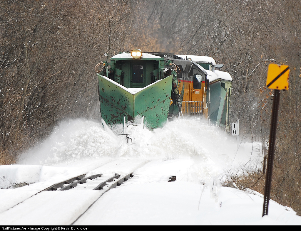 | A rare opportunity presented itself when two ex-Central Vermont plows from two separate railroads were joined for a Plow Extra run from White River Jct., VT to Millers Falls, MA on the New England Central Railroad. The NECR Jordan Spreader 4285 is being shoved by Florida East Coast SD40-2 721 and the GMRC Russell Plow X106 (ex-CV 4212) is along for the ride to be delivered to the Providence & Worcester for lease. |