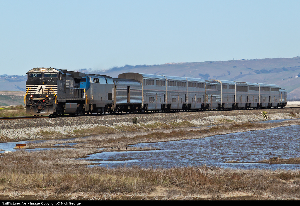 | NS 9834 led today's SB Amtrak Coast Starlight, surprisingly the whole way from Seattle to Los Angeles, without being taken off the point. I caught it this morning passing through Alviso (north of San Jose). |