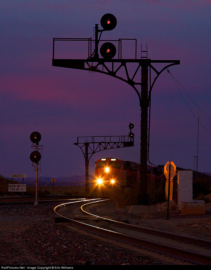 | Dawn is just breaking on Dalies Junction as a hot pig train passes through the signals en route to Belen. The line to the right heads to Albuquerque and was the original mainline, now a secondary line primarily used by Amtrak for the Southwest Chief. |