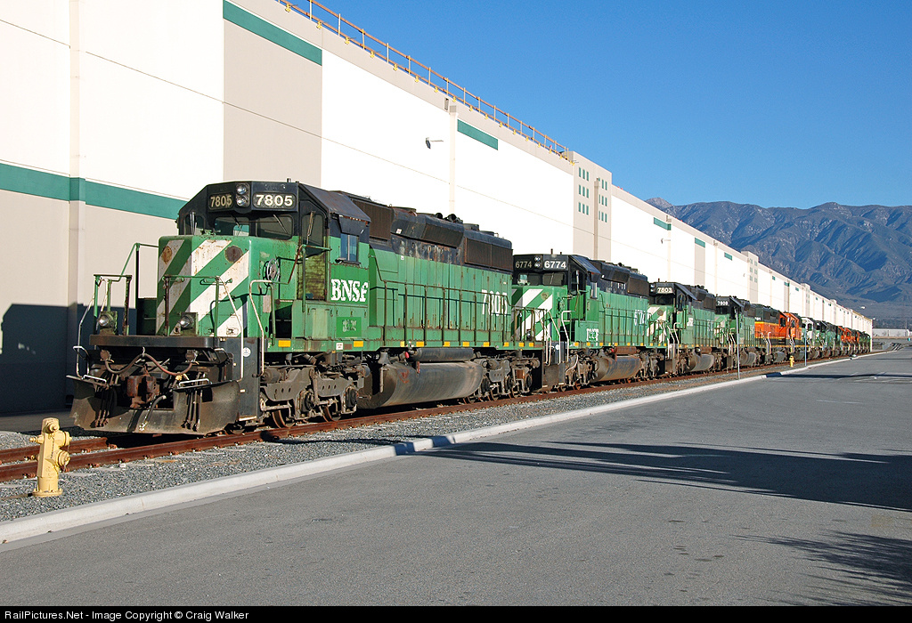 Since my last visit the previous August, the line of stored BNSF SD40-2s in Fontana has changed considerably - fewer of them, and arranged in a more photogenic fashion. BNSF Railway 7805, a former Burlington Northern engine, is at the head of the line of 15 units.