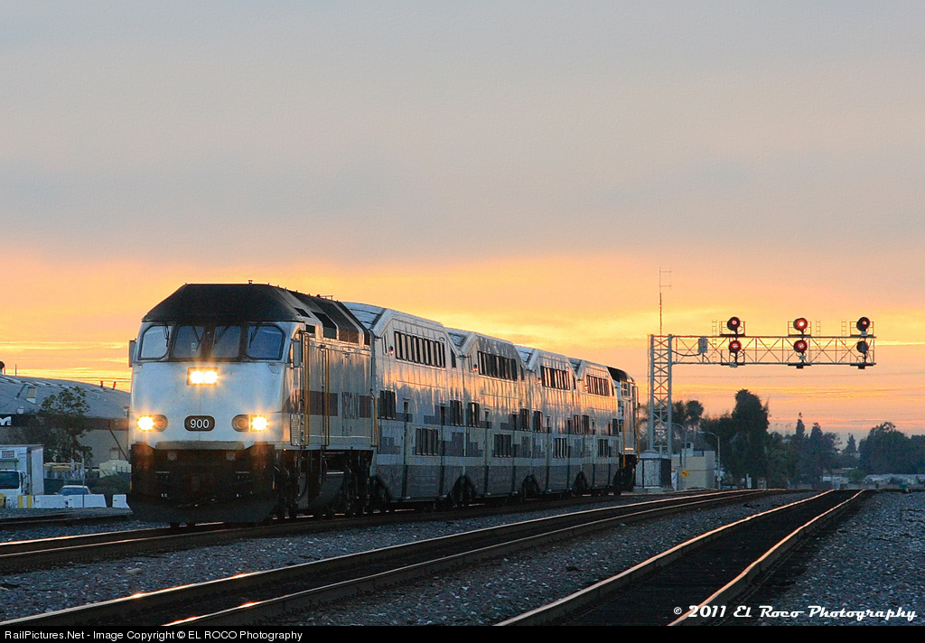 – A Double ended Metrolink Train Number 664 with #900 in the lead approaches Fullerton on a warm evening in February.