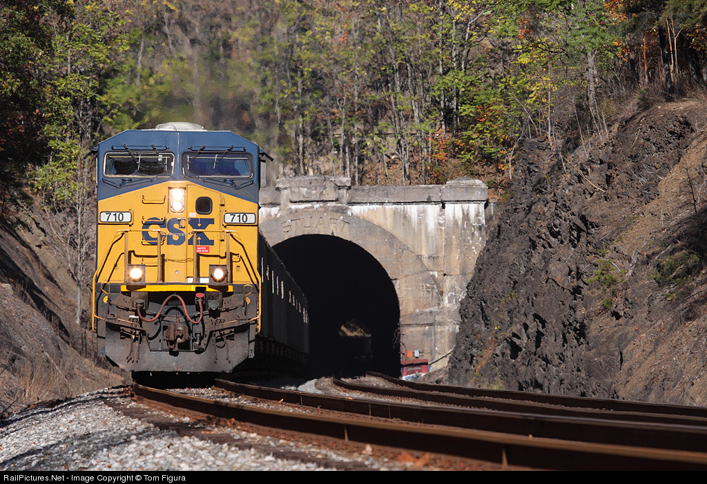 | On a pleasant fall afternoon, a westbound coal empty lead by CSX 710 bursts out of Stuart Tunnel near Magnolia, West Virginia. |