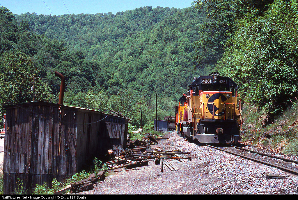 Far be it for me to ever accuse C&O of wasting anything. In a day when "repurpose" seems to be the word, one has to look back at the C&O and conclude they were "king" years ago. Witness the MofW shack to the left. Obviously, it began life as a wooden boxcar many years ago. Upon closer examination, one will note that after those duties were completed, it was "repurposed" as a camp car. As if that weren't enough, it was "repurposed" yet again, this time as a MofW shanty. The scene is at Van, WV on May 19, 1979 and the approaching train is the C&O Pond Fork Mine Run with WM GP40-2 No. 4261 and C&O GP38 No. 3864.
