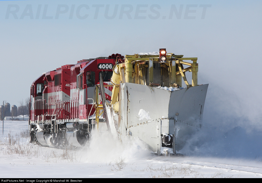 | A few days after the midwests' famous "Snowmageddon" the WSOR sent a Jordan out to clear some drifts in southeastern Wisconsin and northern Illinois. A little powder is pushed here as the train nears the Illinois border. The train cleared all the way to the end of their trackage at Fox Lake, IL. |