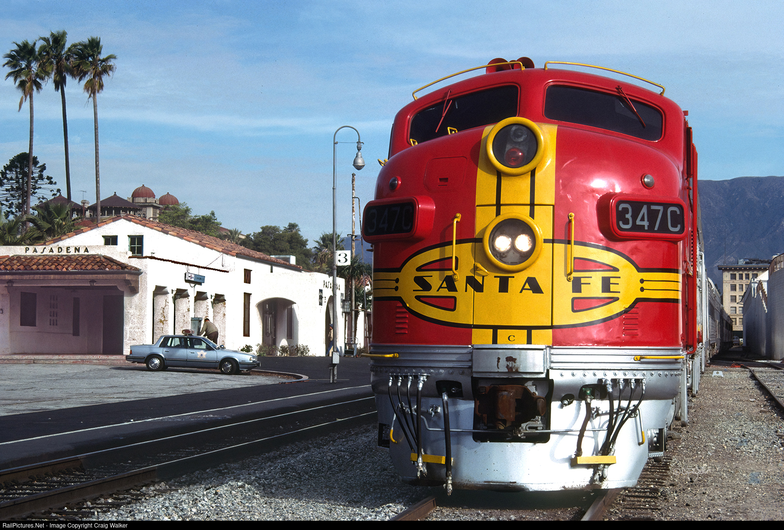Santa Fe had visions of a company museum, and was wise enough to hang onto a variety of locomotives with that in mind. It never happened, of course, and the collection was donated to the California State Railroad Museum in Sacramento. Among those engines was an A-B set of F-units, painted in the "Yellow Warbonnet" colors they wore at retirement. In the late 1980s, the Santa Fe wanted to create some films promoting their upcoming "Superfleet" intermodal service, and the filmmakers wanted some classic Santa Fe power for some of the scenes, which would then dissolve into contemporary scenes as the train passed. The terms of the donation when the collection went to CSRM in 1986 already included a provision that the railroad could have the use of any part of the collection whenever they wanted. The restoration back to the classic red and silver Warbonnet paint scheme was funded through private donations, with the Santa Fe’s San Bernardino Shops, one of several bidders on the job, had the winning bid, with the restoration occurring in March and April 1988. (Personally, I wish they had renumbered these back to their original roadnumber, 39C and 35A … although restoring the B-unit to it’s F3B appearance might have been prohibitive) The Fs are seen here posing in front of the Pasadena, California, passenger station during some of that filming. These days, the Fs are back at the Museum in Sacramento, the Santa Fe is no more and this line through Pasadena is much more active, albeit with light rail vehicles, as the Los Angeles Metro Gold Line. And the restoration of these Fs was the seed that led to the repainting of Santa Fe's FP45 into red and silver "Superfleet" colors, which then carried over to the road's new GP60Ms, Dash 8-40BWs, GP60Bs, Dash 8-40CWs, Dash 9-44CWs and SD75Ms. The early '90s were a great time to be trackside on the Santa Fe! (Pasadena, California – February 7, 1989)