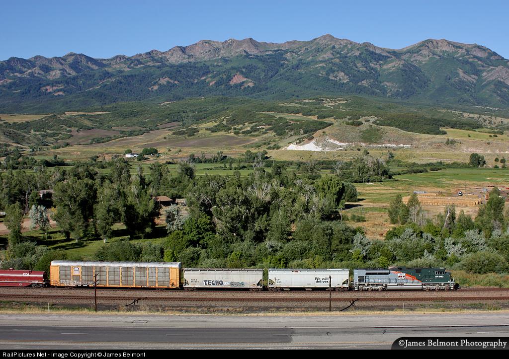 | The Western Pacific heritage SD70ACe leads a North Platte, NE to West Colton, CA manifest west through the Weber River Valley at Peterson, Utah. |