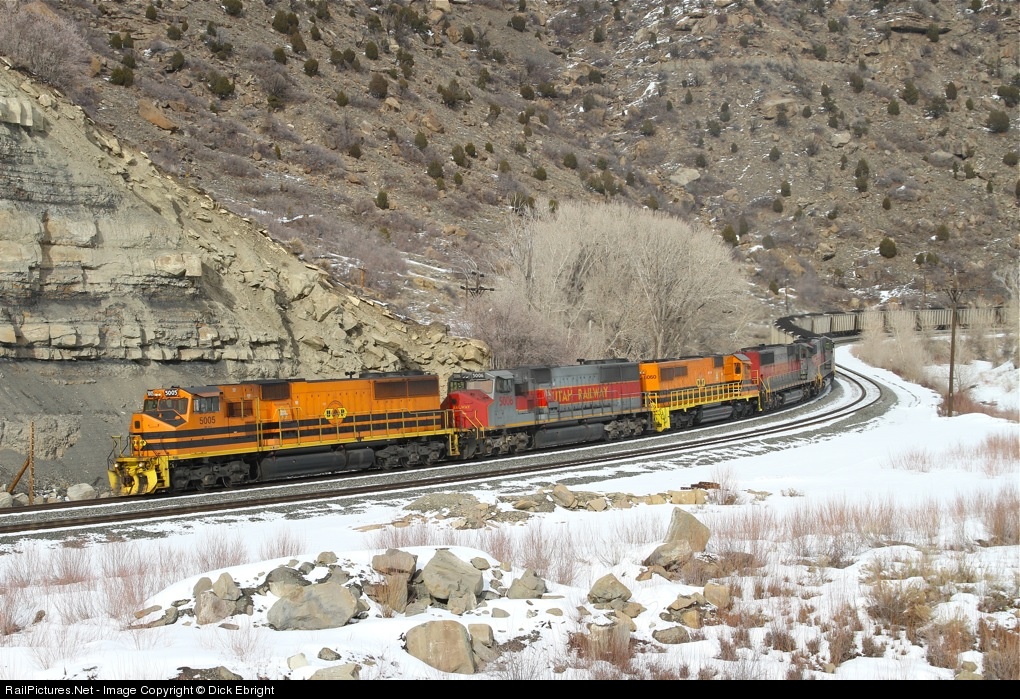 Utah Ry #5005, an MK5000C model, and 4 other URy units lead a loaded coal train up Utah’s Price River Canyon. The location is the horseshoe curve just below Kyune. Out of sight and around the corner is a mid train helper set. The train was traveling much slower than usual and after taking this shot and leaving for home I found out why. One of the helper units, 6062, had blown a turbo on the climb and was shut down. Radio talk between the head end and helper crew indicated that the unit was making lots of black smoke and there was oil everywhere inside the long hood. Too bad I didn’t stick around for the helpers to pass me here, but the sucker hole in the clouds that allowed this sunny shot closed up and the picture would have been pretty dark, so I left before the sick helpers showed up.