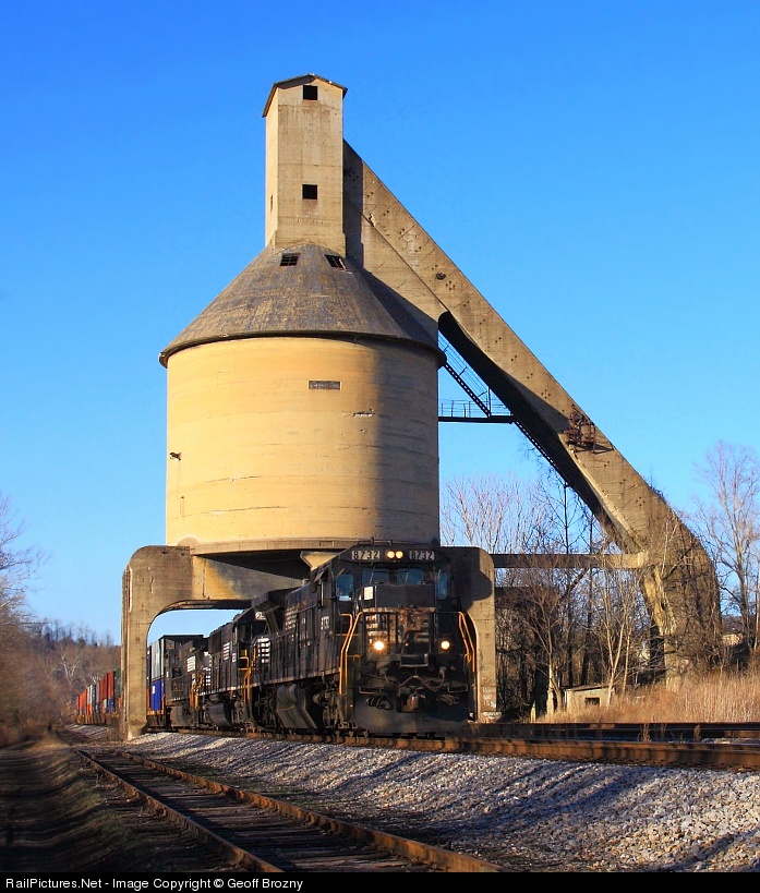 | Stack train NS 234 passes under the very large former NW coaling tower, in Prichard, as it heads east on the Kenova District in the late evening. |