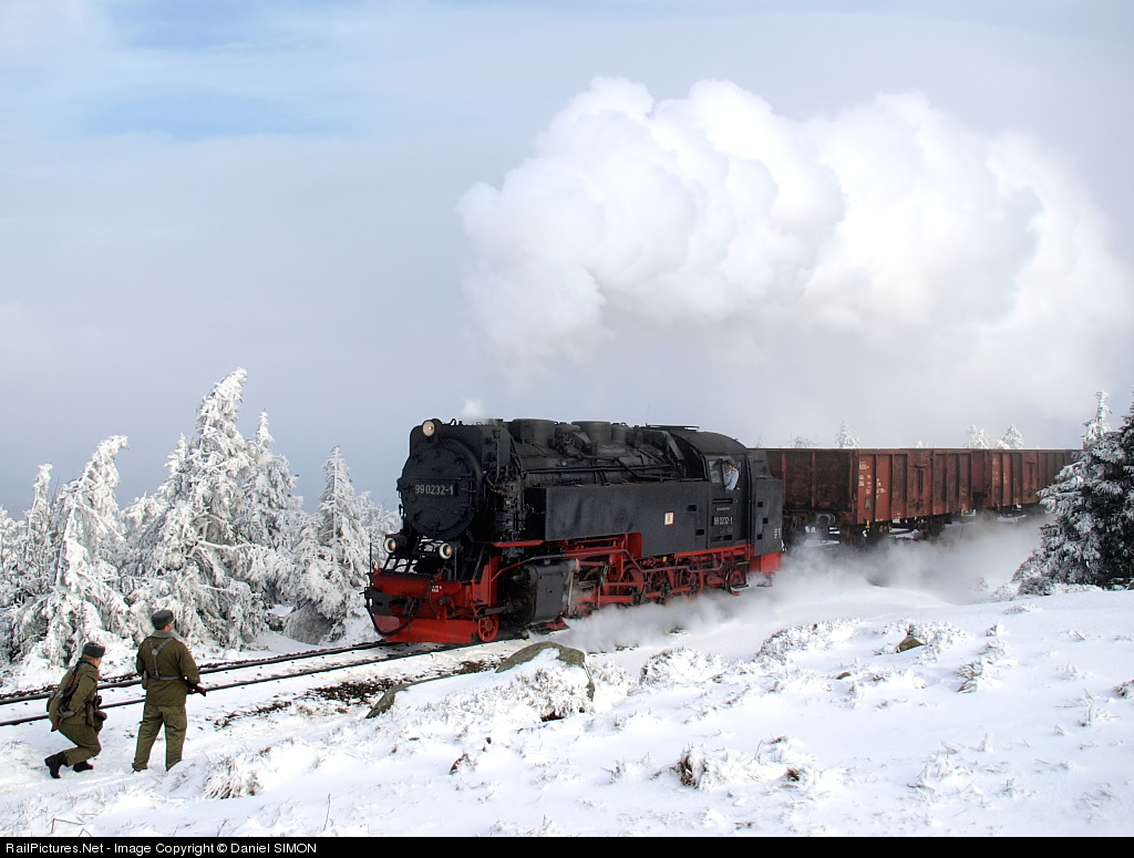 | Back in the GDR, border soldiers regularly observed the freight trains bringing supply for the troops based at the summit of the Brocken mountain in the Harz. The former border to West Germany was very close and the soldiers wanted to avoid any escape attempt to the West. The HSB 99 7232 is masquerading as the Deutsche Reichsbahn 99 0732 (The "0" means that the engine is fuel fired as it used to be in the past during DR days). A Bernd Seiler charter. |