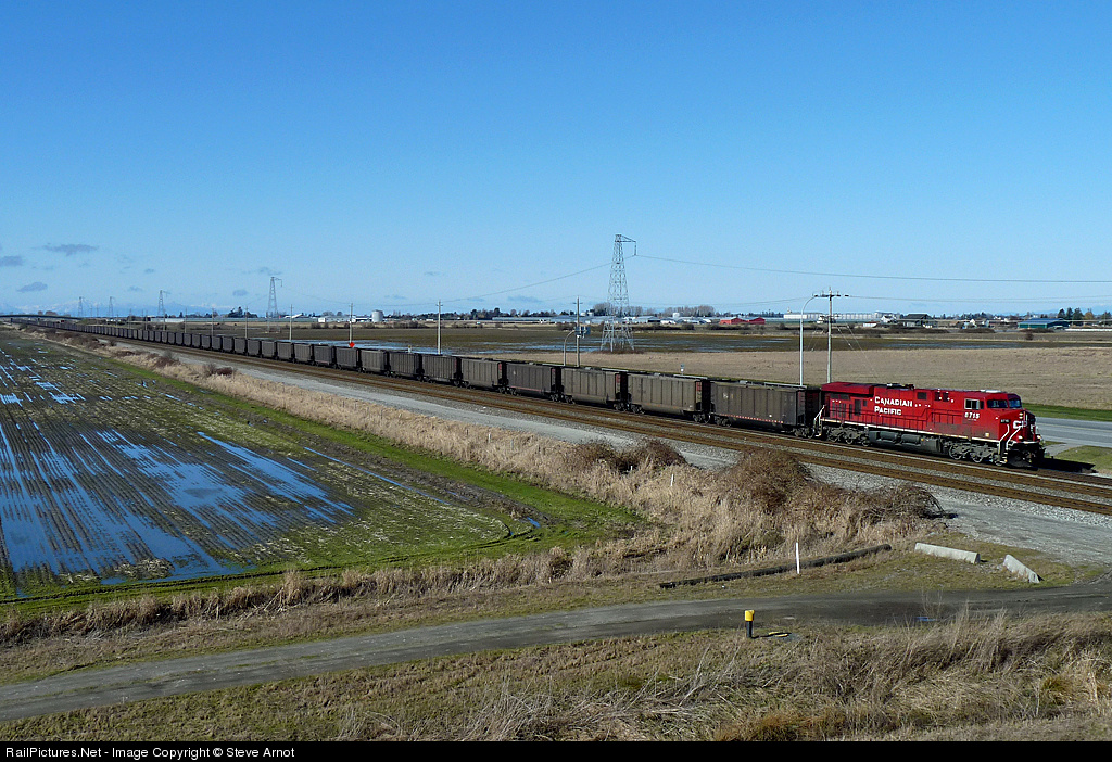 | CP 8715, with CP 8540 mid-train and CP 8543 on the rear, leads an empty coal train down the north main as they depart from Roberts Bank and head for the East Kootenay Coalfields. |