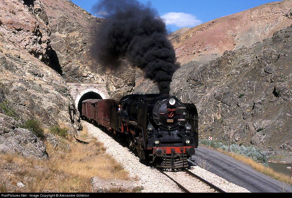 | 56.009 (Esslingen) is seen here at the start of the very spectacular railway line from Erzincan to Divrigi, right in the hearth of Turkey. The line will then follow the Euphrate River through a remote gorge before reaching Divrigi. This is one of the first tunnel after Erzincan. |