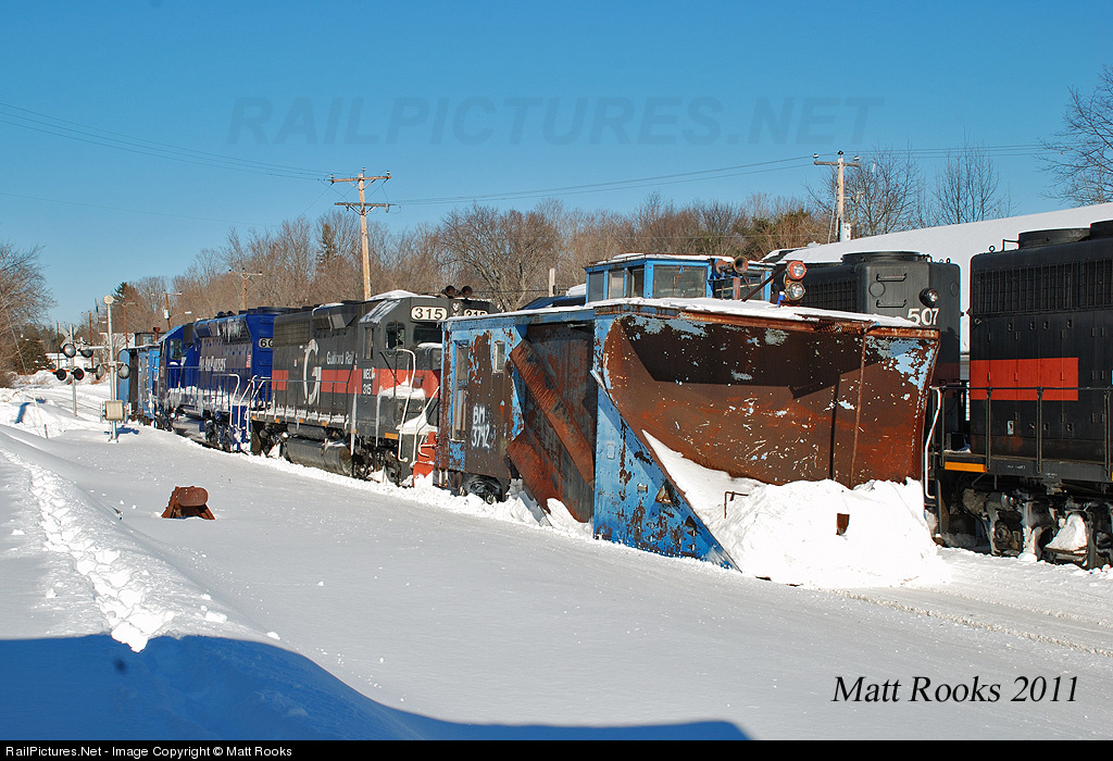Westbound plow extra meets an eastbound AYWA at Newfields. The plow extra is using B&M double track plow 3742 , MEC 315, MEC 601, B&M double track plow 2743.