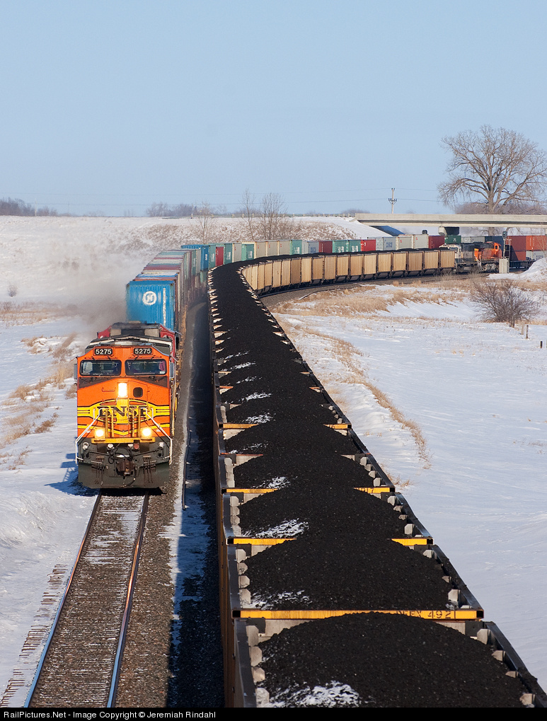 | At the famed Hawley bridge, a westbound stack train glides by as a load of coal grinds its way uphill. Trains leaving Dilworth Yard have to conquer a long steep climb out of the Red River Valley. |