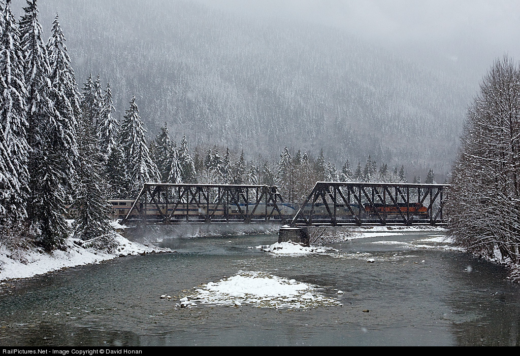 Dashing through the snow: Winter has finally arrived in the Pacific Northwest, and with it comes more trouble for Amtrak's Empire Builder. Running some six hours late on a snowy Saturday, westbound No. 7 rumbles across the Skykomish River with BNSF 1051 being the only functioning locomotive on the train. AMTK 91 had been isolated west of Spokane and was providing HEP only, leaving AMTK 166 as the train's sole motive power -- until it too died, stranding the train on the main ten miles east of Wenatchee until BNSF was able to send a rescue engine out to Rock Island and continue the slow westward trek. One hopes that to offset the delays, the passengers took some small comfort in enjoying the opportunity to experience a rare daylight run through the snow-blanketed Cascade Range.