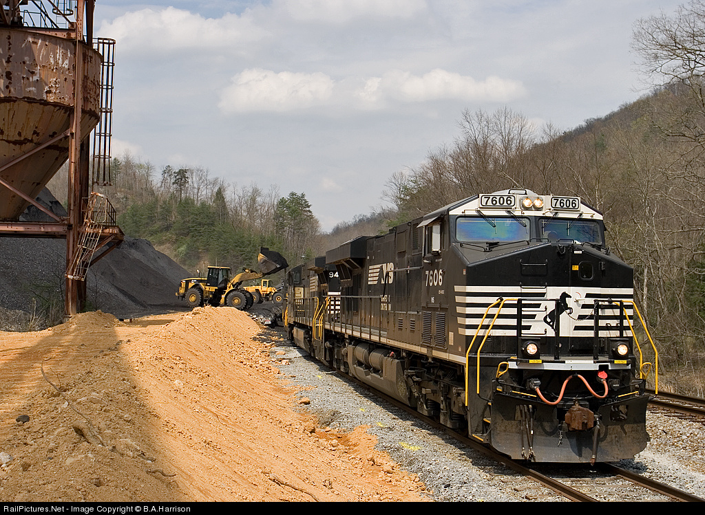 Leading the way with three motors, NS 606 slowly idles a string of mtys under the busy frontend loaders.
