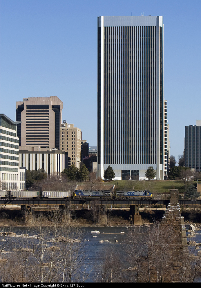 An eastbound CSX unit coal train drops downgrade through Richmond, VA on the James River Viaduct on Feb 12, 2011 with AC4400CWs No's. 528 and 416. The building behind the locomotive is the Federal Reserve Bank of Richmond, one of the first high rise buildings built along Richmond's riverfront. The bridge piers in the lower right are from the former ACL (and previously Richmond & Petersburg) bridge. It was ACL's entrance to Richmond until RF&P and ACL built a new structure about two miles upstream in 1919. It survived for years as ACL's connection to the C&O, but was dismantled in the early 1970's under SCL.