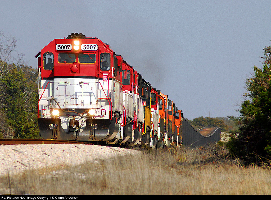 A nine-unit consist of five WAMX/AWRR (ex-C&NW) GP50s, a WAMX SD40-2, two BNSF C44-9Ws and a BNSF ES44DC roll a hundred car train of empty rock gons west through the Texas Hill Country northwest of Austin for loading at one of the massive quarries near Marble Falls. The nine units can handle the empties with ease but the loaded eastbound train will require every bit of that power to get back to the UP at McNeil, TX for turnover to BNSF, who will use UP trackage rights to return to home rails.