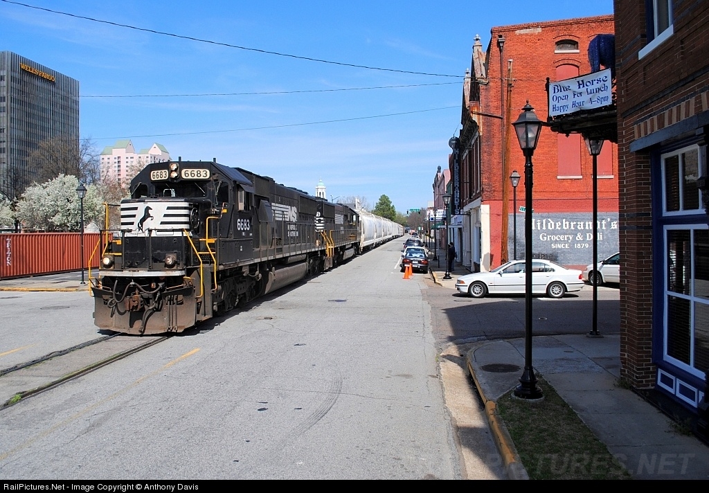 Battle of the Horses! For the second day in a row, NS 191 sports a standard cab EMD leader, this time in the form of NS 6683 and another sister SD60! After waiting for 'parking space' to open up inside NS Augusta Yard, NS 191 finally got the block to head down the middle of 6th Street. Today's spot, the corner of 6th & Ellis Streets features a showdown between the black throughbred on the nose of NS 6683 and the Blue Horse posed on the balcony of the namesake Restaurant & Bar. It seems as if the Blue Horse could give a 'horse's ass' about the throughbred passing by!