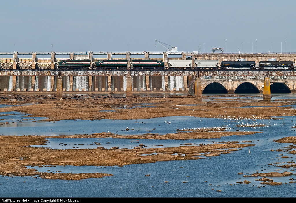 | As a variety of birds feed in the shallow river bottom, a westbound ethanol train crosses the Pee Dee River alongside the massive Tillery Lake dam on the rarely photographed Piedmont Division of the ACWR. The Piedmont Division is part of the original Norfolk and Southern mainline. I can imagine this is a wild ride for the crew on occasions when the spillways are open when they pass. |
