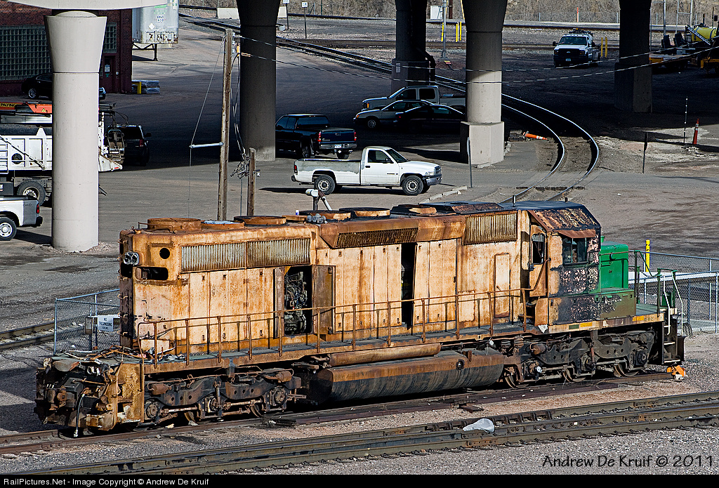 The remnants of BNSF 6851 sit in Denver north yard, nearly two years after an accident with an ethanol tanker. After the accident the engine was able to move under its own power.
