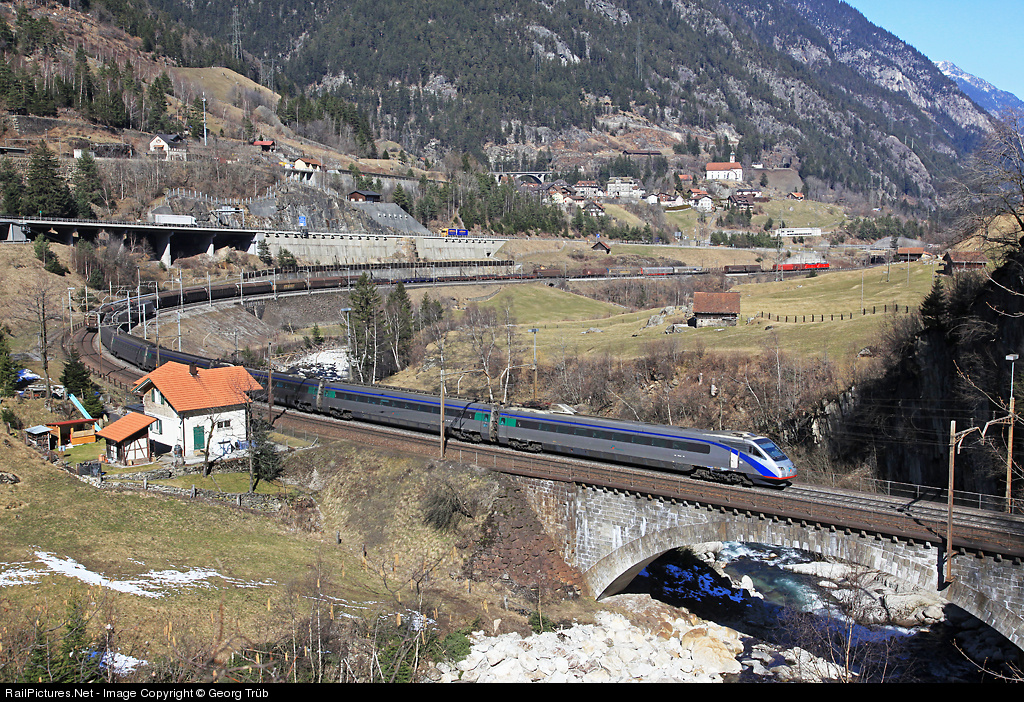 | Tilting train ETR 470 007 of Trenitalia is running as EC 17 from Zürich to Milan and is just crossing lower Wattinger bridge, while a freight train of DB Schenker with two 185 locomotives is riding the opposite direction down to Erstfeld. On the left of the famous church of Wassen you can see the middle Meienreuss bridge on the second level of the railway line. |