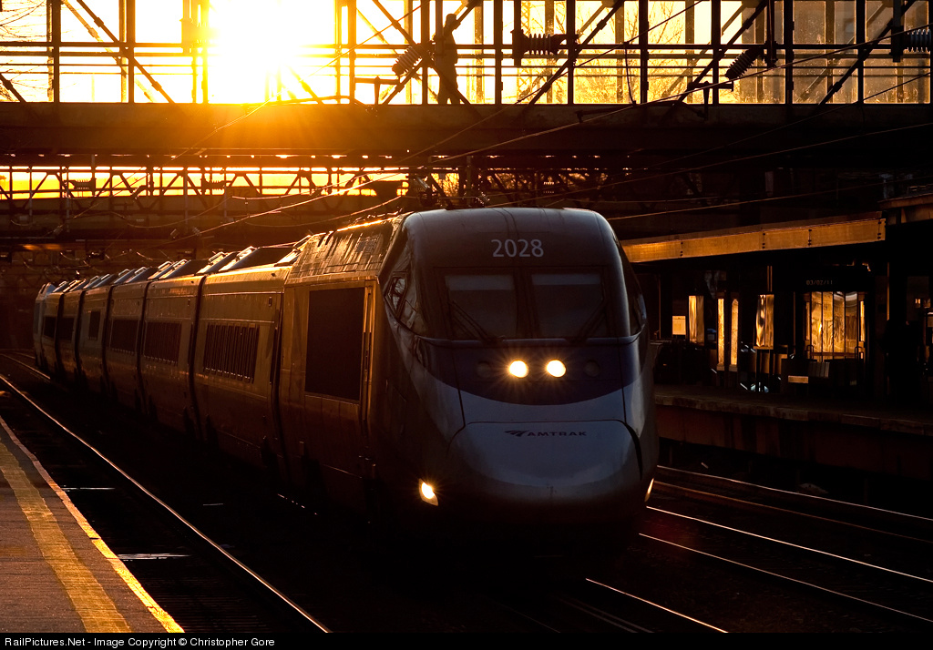 | With the setting sun behind it, an Amtrak Acela train heads north, through the Harrison New York station. |