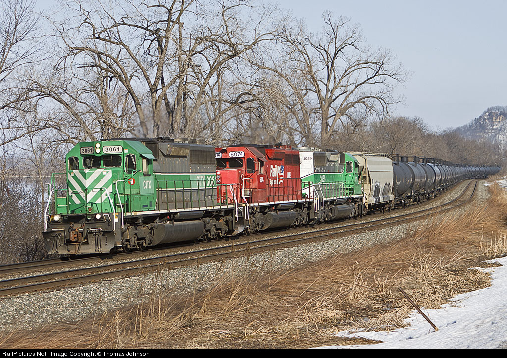 | Train 637 heads north along the Mississippi River just south of Winona, MN. This train swapped power with CP 276 in LaCrescent, MN. |