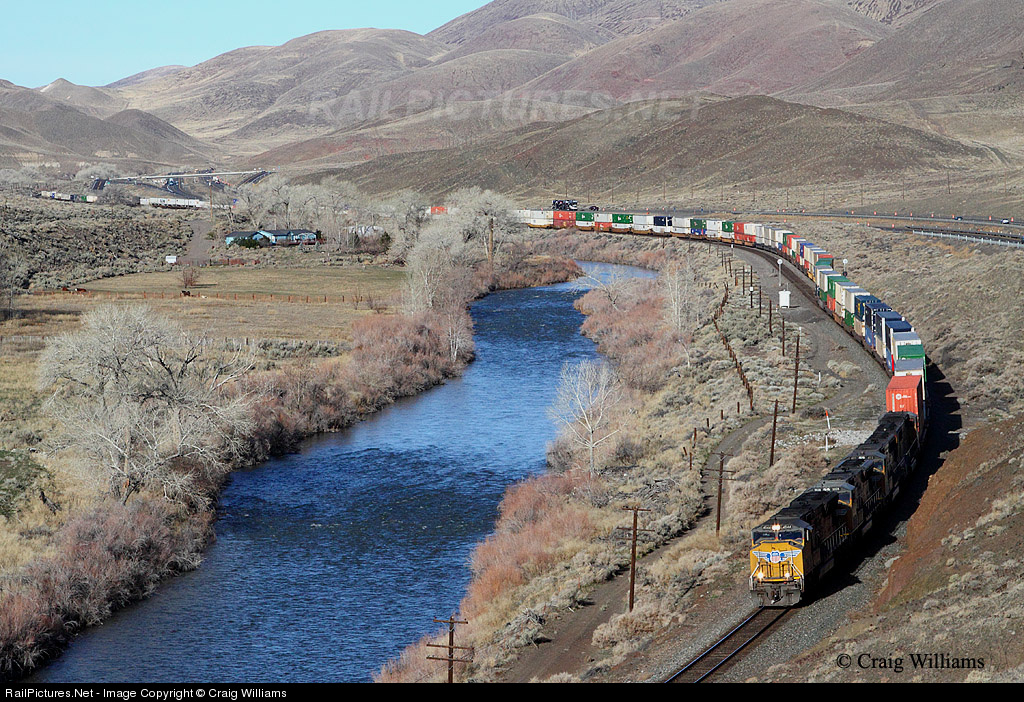 Eastbound Lathrope, CA, to Global 2 Intermodel Facility, IL, pulls out of the siding at Thisbe after meeting Amtrak #5. Thisbe is located at MP 267, or 20 miles east of Sparks Yard. This area isn't the mountain area like west of Sparks on Donner Pass, but still has it scenic appeal. Here the elevation is still 4180 feet.